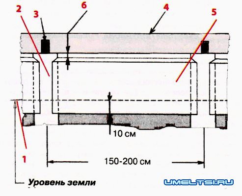 Рис. 2 Схема свайного фундамента 1 — уровень земли, 2 — свая, 3 — крепежная скоба 4 — брус основания (балка), 5 — подпорная плита 6 — зазор в 1-2 см
