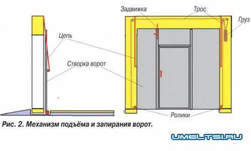 На рисунках 1 и 2, демонстрирующих принцип работы механизма ворот, видно, где закреплены цепи и как проведены тросы противовеса.