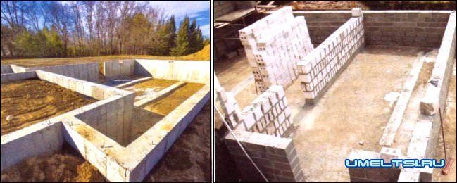 Стены выполняют монолитными или складывают из блоков. Первый вариант предпочтительнее, так как меньше подвержен подвижкам и протечкам