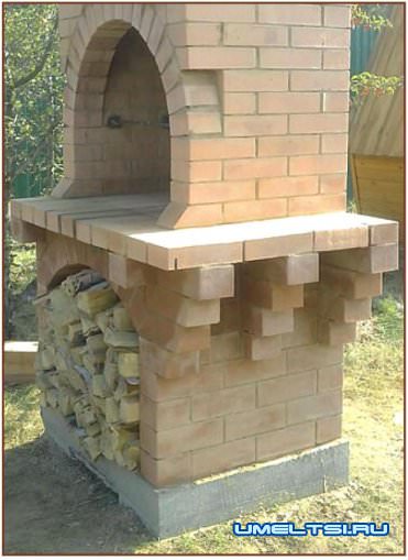 Дровяник сложил из полуторного лицевого кирпича высотой 85 мм. Как правило, щелевой кирпич не используется при сооружении печей. Но эта часть очага никогда не будет сильно нагреваться, а потому применение такого кирпича здесь вполне допустимо.
