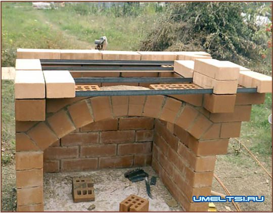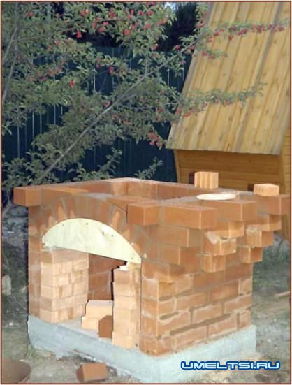 Полки и топку мангала я сложил из печного кирпича Челябинского завода «Кемма». Кирпич очень хорошего качества, но есть небольшие погрешности в размерах. Например, толщина его с лицевой стороны может достигать 70 мм вместо положенных 65 мм. Но толщина шва кладки в печах должна быть от 3 до 5 мм, и чтобы качественно выполнить работу, необходимо было устранять данный дефект. Я это делал при помощи небольшой болгарки с алмазным диском по камню. Проём топки, как и дровяника, я украсил аркой.