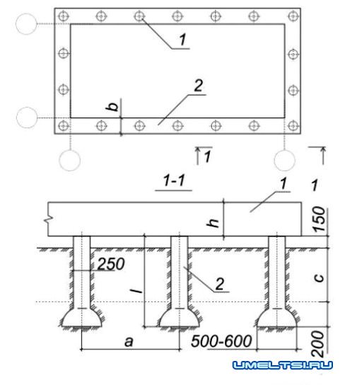 Фундамент ТИСЭ: 1 - ростверк; 2 - буронабивная свая; h - высота ростверка 300-600 мм; b - ширина ростверка; а - расстояние между сваями; I - длина сваи (1=150 мм + с + 200 мм, где с - глубина промерзания грунта)