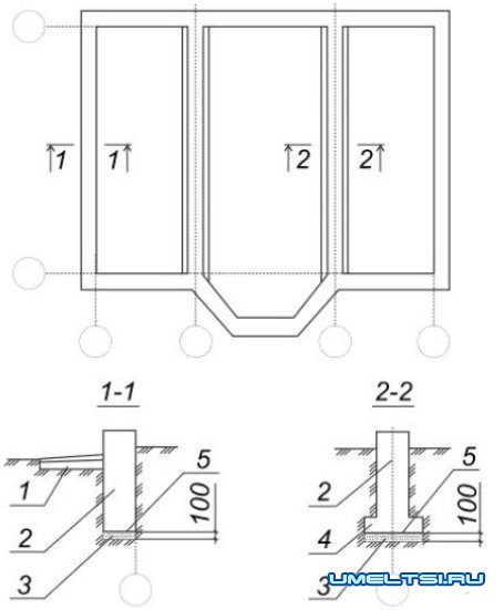 Ленточный фундамент: 1 - отмостка; 2 - фундаментная стена; 3 - песчаная подготовка; 4 -фундаментная подушка; 5 - подошва