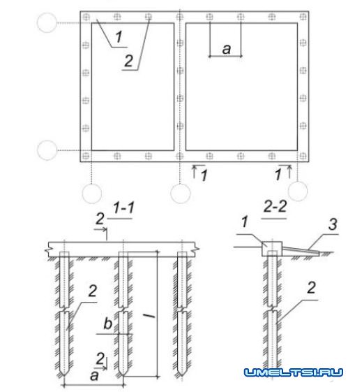 Свайный фундамент: 1 - ростверк; 2 - свая; 3 - отмостка; а - расстояние между осями свай; b - размер сечения сваи; I - длина сваи (определяются расчетом)