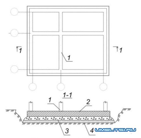 Плитный фундамент: 1 - стены; 2 - железобетонная фундаментная плита; 3 - щебеночная подготовка; 4 - песчаная подготовка