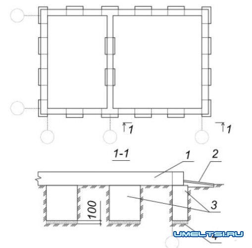 Столбчатый фундамент: 1 - рандбалка; 2 - отмостка; 3 - фундаментные стены в виде столбов; 4 - песчаная подготовка