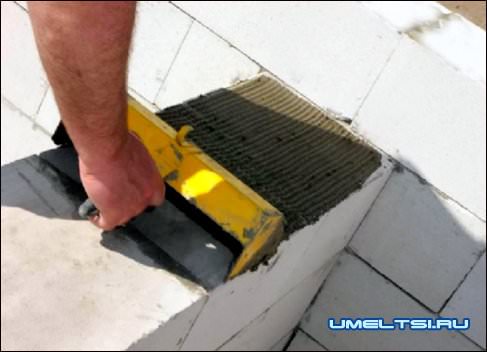 Для кладки стен из газобетона используют как традиционный цементно-песчаный раствор (в этом случае выполняют горизонтальные и вертикальные швы толщиной около 1 см), так и клеевой. Последний эффективен для кладки однослойных и многослойных стен из качественных блоков с идеально точной геометрией (отклонения не должны превышать 1—2 мм) и пазогребневой структурой торцевых граней. Клей наносится только на горизонтальные швы слоем толщиной 1—3 мм. Для этого используют специальные инструменты — так называемые каретки, обеспечивающие равномерное нанесение раствора на всю толщину стены. Следует учитывать, что даже при таком способе кладки первый слой блоков укладывается на традиционный цементно-песчаный раствор. Традиционный раствор можно заменить теплосберегающим, улучшающим теплоизолирующие параметры стен.
