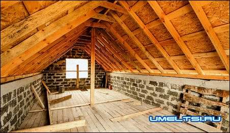 Возведение мансарды начинается с укрепления перекрытия между первым и мансардным этажами и установки стропильной конструкции, для которой используются хорошо высушенные доски и брусья хвойных сортов деревьев, обработанные составами против гниения. Если длина крыши превышает 7 м, стропильная система будет достаточно тяжелой, в этом случае необходима установка коньковой балки, на которую будут опираться стропильные ноги. При меньших размерах крыши можно обойтись растяжками, которые впоследствии послужат в качестве потолочных балок мансардного этажа.