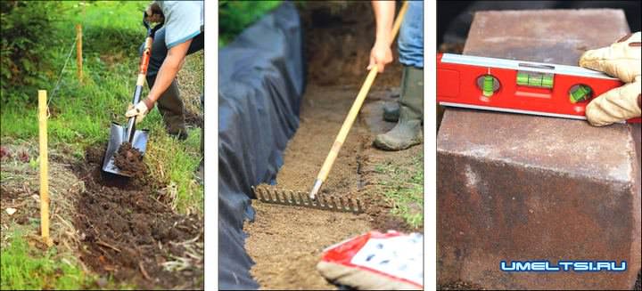 5. Установите оставшиеся блоки основания в песок и выровняйте их по задней и верхним поверхностям, проверяя уровнем. Утрамбуйте блоки колотушкой.