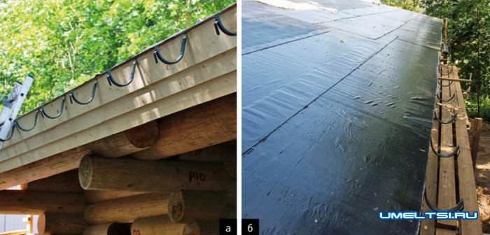 К обшивке свеса крыши прикрепляют крюки водосточных желобов и монтируют обшивку карнизов, под которой делают входные отверстия для воздуха в вентилируемом зазоре крыши (их прикрывают сеткой от насекомых) (а). Далее по обрешётке устраивают сплошной настил из 0СП-плит, на который в оговорённых инструкцией производителя случаях наклеивают ковёр гидроизоляции (6).