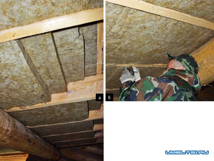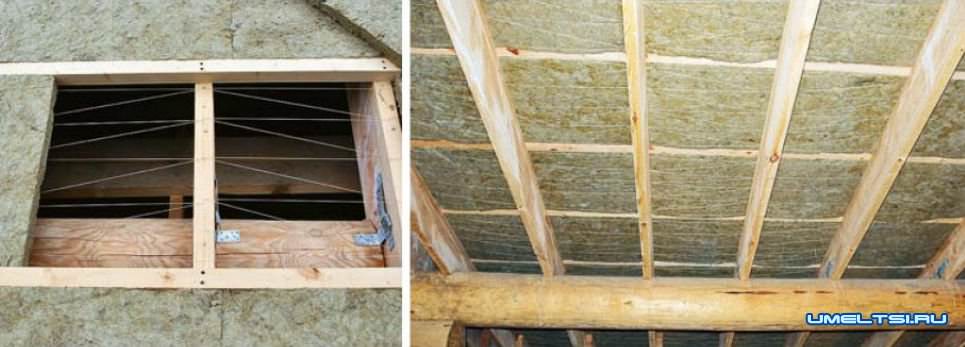 Плиты минераловатного утеплителя послойно располагают между стропилами, причём таким образом, чтобы стыки плит в каждом слое не совпадали между собой (а). Чтобы уложенный утеплитель не упал, между стропилами снизу «зигзагом» натягивают капроновую нить (6)
