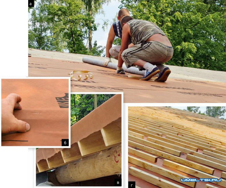 Поверх утеплителя поперёк ската кровли начиная с карнизного свеса (в) раскатывают полотна влагоизоляционной мембраны (а), прикрепляя их к обрешётке скобами степлера (6). Каждое последующее полотно укладывается на предыдущее с нахлёстом, величину которого производитель оговаривает в инструкции по применению матерала. Смонтированную мембрану прижимают рейками контробрешётки длиной около 1 м, оставляя проходы для воздуха (г)