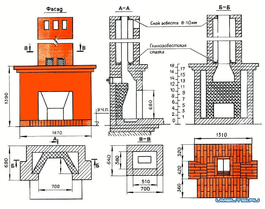 Возвели боковые и передние стенки камина из обычного полнотелого красного кирпича (см. схему). Чтобы увеличить отражение тепла, заднюю стенку топливника выложили с наклоном в сторону помещения, а две боковые, соответственно. — к центру топливника.