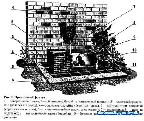 Сам фонтан может быть любым: от простейшей столбчатой стойки сприкреп-ленным шлангом (рис.1) до специальной каменной стенки, декорированной фрагментами старых лепных украшений (рис.2) или с использованием неожиданных различных элементов, найденных на чердаке или даже на свалке.