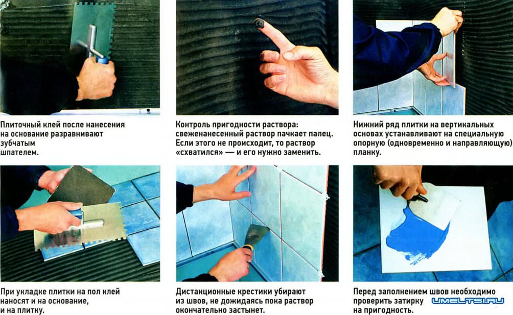 Прежде чем начать приклеивать плитку на вертикальную основу, к ней надо прикрепить рейку или уголок, на который будет установлен первый ряд плиток. Это предотвратит сползание кафеля.
