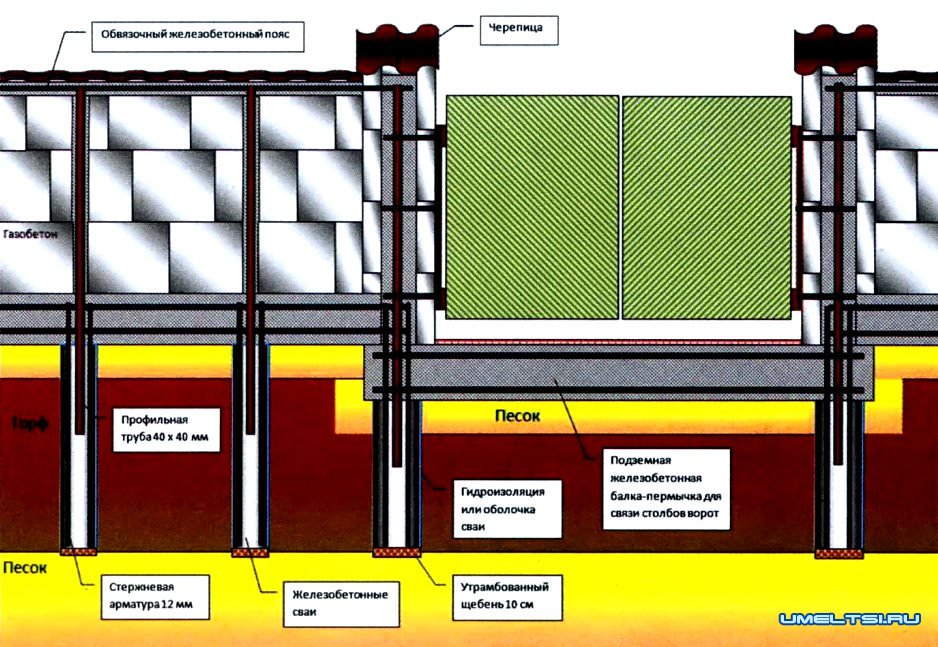 Рис. 1. Схема армирования фундамента и столбов для ворот забора из газобетонных блоков.