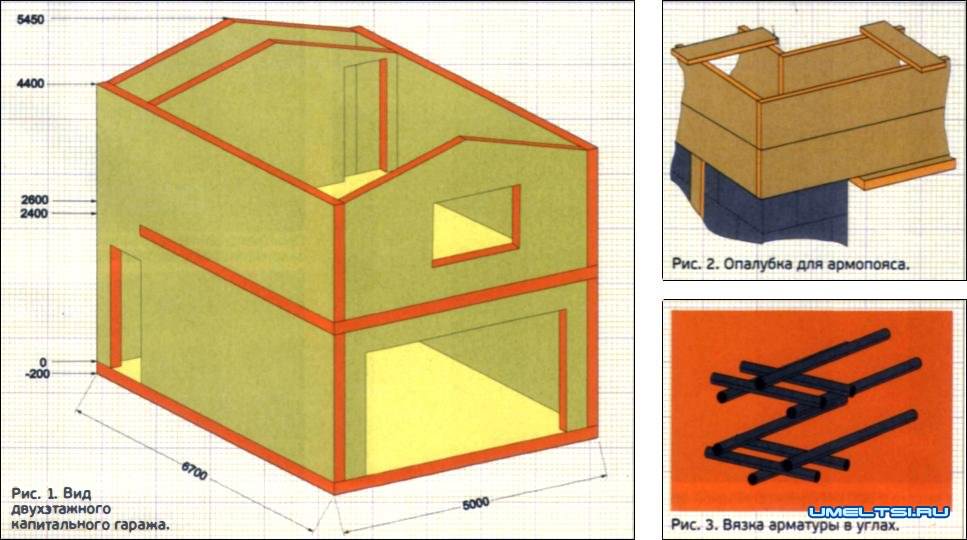 Строители рекомендуют устраивать армированный монолитный бетонный пояс поверх несущих стен, сложенных из легких пено- или газоблоков. Он позволяет равномерно распределить нагрузку от вышележащих конструкций здания на несущие стены. Для этого по периметру несущих стен выставили опалубку (рис. 2). Каждый боковой щит опалубки сколачивали из двух досок сечением 40 х 100 мм. скрепляя между собой обрезками досок 25 х 20 мм примерно через 1.5 м. На углах гаража боковые щиты сшили саморезами в единый короб. Низ опалубки в проёмах для ворот и двери сделали из двух досок 40 « 120 мм. которые прикрепили снизу к боковым щитам саморезами. В проёмах установили подпорки из деревянных столбиков.