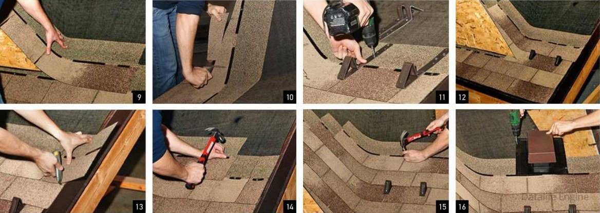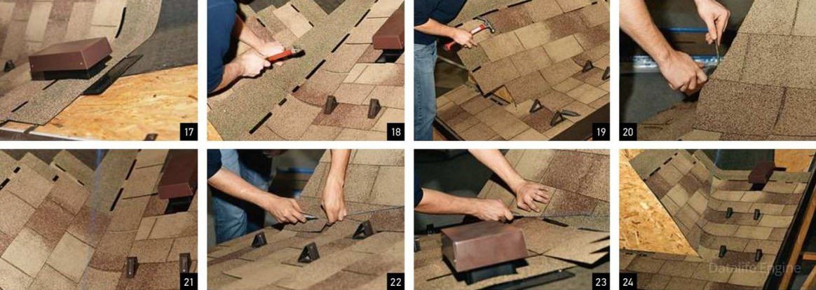 Их ножки привинчивают к основанию и закрывают черепицей следующего ряда. 13. Гонты на торце крыши обрезают для беспрепятственного стока воды вдоль фартука.