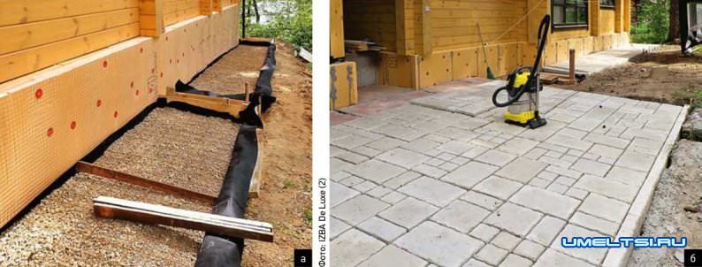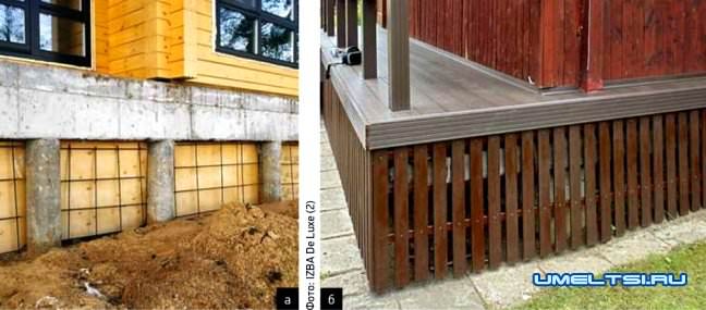 а-б. Чтобы снизить теплопотери дома и воздействие сил морозного пучения на фундамент, ростверк утепляют снаружи плитами ЭППС и возводят бетонную отмостку (а, 6). Утепление особенно необходимо в случае свайноплитного фундамента, где есть риск подъёма промёрзшим грунтом краёв плиты