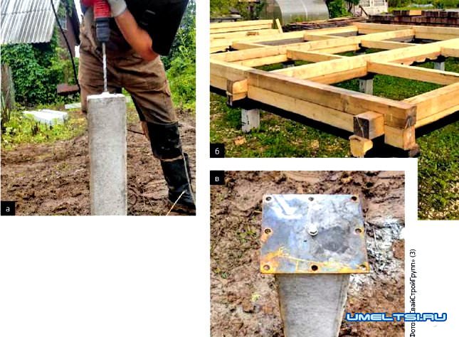 а-в. Для деревянных домов изредка строят фундамент без ростверка. В этом случае каждую сваю оснащают опорной площадкой (а, в). Затем укладывают слой гидроизоляционного материала толщиной не менее 5 мм и с помощью «глухарей» крепят к сваям окладной венец дома (6), который, как и балки перекрытия первого этажа, тщательно антисептируют