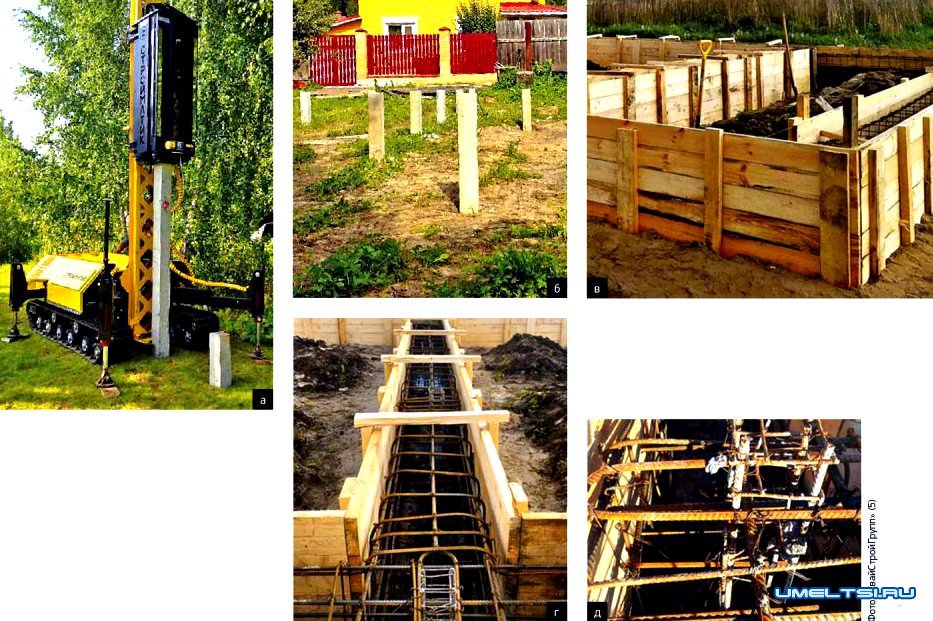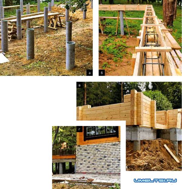 а-г. При устройстве бурового свайного фундамента оголовки обсадных труб выставляют по горизонтали с помощью гидроуровня и натянутого шнурка (а). Опалубку для висячего ростверка надёжно подпирают досками (б).