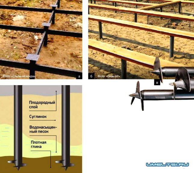 Обвязочные балки (а, 6) способствуют равномерному распределению нагрузки на сваи. На склонах фундамент часто усиливают стальными раскосами, увеличивающими жёсткость конструкции. Наиболее ответственная часть сваи — лопасть (в), она должна быть надёжно приварена к трубе