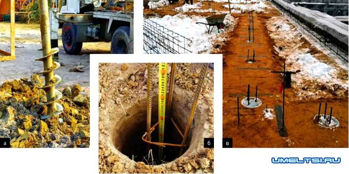 а-в. Монтаж буровых свай проще всего осуществить зимой либо засушливым летом (а). Наиболее распространённый диаметр скважин — 200-250 мм, а их число и глубина рассчитываются в зависимости от нагрузки и геоусловий (б). Над землёй оставляют выпуски арматуры, которые затем увязывают с каркасом ростверка (в)