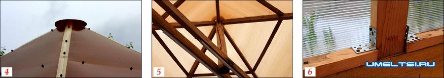 4. Для крыши пять балок по 1,85 м длиной зарезал к бревну и прибил их гвоздями 120 мм (каркас для крыши). Коричневый лист поликарбоната 2x6 м и толщиной 6 мм раскроил на пять одинаковых треугольников. Прикрутил каждый к балкам крыши шурупами со шляпкой и уплотнителем, чтобы вода не протекала. А снаружи на вершину крыши положил кружок поликарбоната для надежной защиты от дождя (фото 4). Стыки листов закрыл пластиковыми уголками. Чтобы крыша не вибрировала от ветра, саморезами прикрутил к балкам и поликарбонату изнутри дополнительно пять поперечин (фото 5)