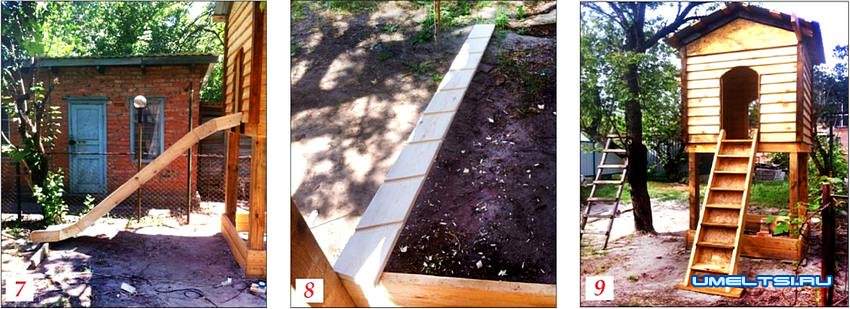 Для лестницы из доски сечением 15x4 см вырезал две стойки, используя стусло, выпилил пазы под ступеньки (фото 8). Собрал лесенку и прибил к ее тыльной стороне листы ДСП (фото 9), чтобы малышу было удобнее взбираться.
