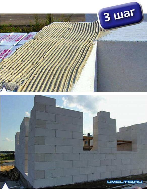 Для геометрического контроля кладки используют простые, но эффективные приспособления: шнур-причалку, отвес, треугольник (выверка углов). Чтобы обеспечить теплотехническую однородность стен, блоки укладывают на «теплый» минеральный раствор, который наносят на горизонтальные и вертикальные грани блочных изделий особой зубчатой кельмой. Бороздки повышают сцепление блоков с кладочными швами, толщина которых, кстати, составляет всего 3-7 мм (при применении цементно-песчаного раствора - 10-15 мм).