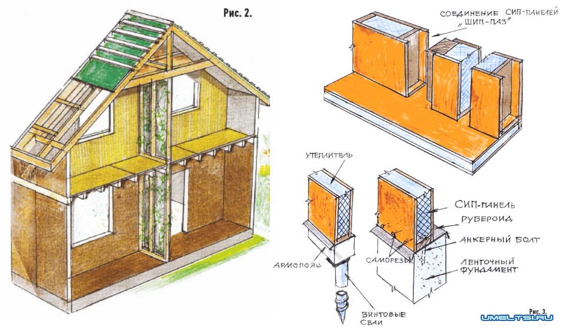 Сборные стеновые конструкции, которые впервые начали применять в Канаде, — это те же готовые панели, но немного улучшенные: между двумя ориентировано-стружечными плитами (ОСП) помещают слой пенополистирола. Предварительно ОСП обрабатывают средствами от пожара, гниения и насекомых. Вместо ОСП также нередко применяется гипсокартон или фибролитовые плиты. В качестве утеплителя могут использовать и базальтовую вату, и обычный пенопласт Панели крепятся между собой по системе «шип — паз», что считается весьма надёжным способом фиксации (рис. 3). Отдельно собирать для такого дома каркас необязательно: стеновые конструкции и перекрытия, которые входят в готовый домокомплект, выполняют функции несущих опор.