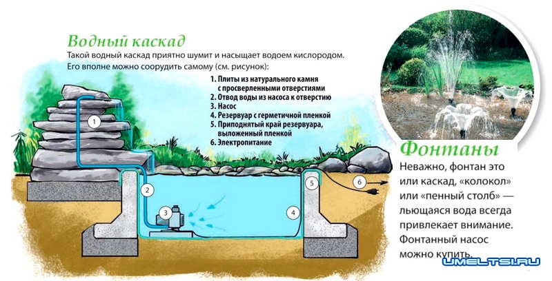 Такой водный каскад приятно шумит и насыщает водоем кислородом. Его вполне можно соорудить самому (см. рисунок):