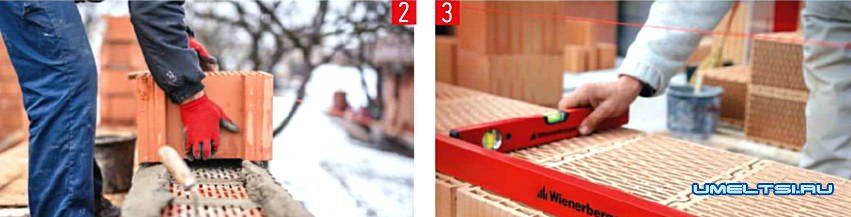 Перед укладкой каждого следующего ряда самый нижний смачивают водой. В углах и в проёмах нельзя использовать блоки, разрезанные наполовину. Для проверки вертикальности и горизонтальности кладки необходимо использовать уровень (фото 3). При закладке углов можно использовать ровную остроганную рейку с насечками через каждые 231 мм (219 мм — высота блока и 12 мм — толщина растворного шва). Длина рейки должна соответствовать запроектированной высоте готовой стены.