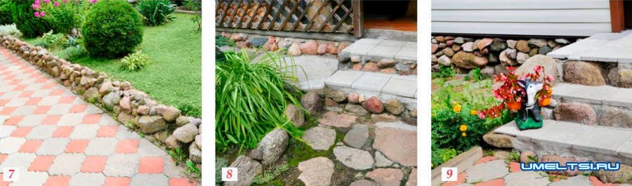 Крыльцо в доме также оформил камнями. На его месте выкопал слой земли, засыпал слой песок, утрамбовал и на цементный раствор уложил первую ступеньку из камней. Просушил. Сверху засыпал песок под следующий уровень и выложил второй слой, а затем аналогично третий. Сверху ступенек уложил на цемент бетонную плитку. Отмостку и цоколь дома также оформил камнями (фото 8, 9).