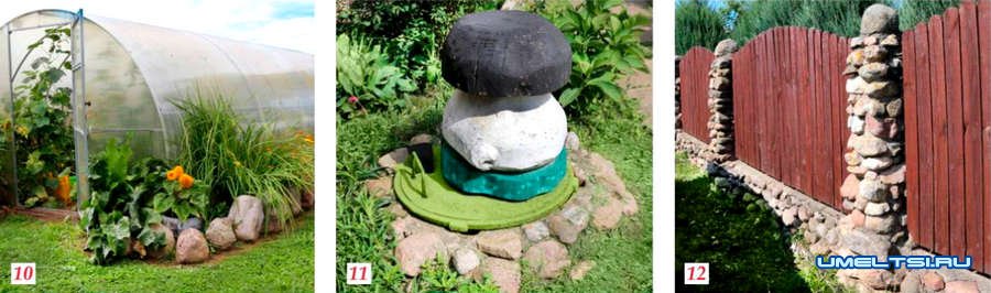 Для украшения участка выложил вокруг теплицы валуны (фото 10). Наружное кольцо канализационного люка также выложил камнями и серху крышки разместил декоративный гриб из полена (фото 11)