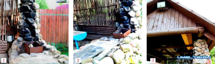 К стойкам приварил болты и прутки с резьбой для монтажа несущего каркаса из металлических труб. Начал обкладывать стойки камнями. Для этого выкладывал вокруг металлической трубы ряд камней, фиксируя последние на цементный раствор. Оставлял сохнуть. Затем выкладывал следующий ряд. И так постепенно выводил стойки до верха. Для формирования боковых стенок использовзл «деревянные щиты, из которых построил своеобразные опалубки для стен. Выкладывал камни по одному ряду, оставлял сохнуть на сутки и только после этого укладывал следующий ряд. В одной боковой стене при кладке камней сразу предусмотрел место для мангала (фото 1) разделочного стола (фото 2).