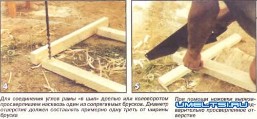 Большинство, видимо, согласится со мной, что установить в грунт небольшие по площади сечения опоры так, чтобы точно выдержать и размеры рамы основания и строгую прямоугольность ее формы, — не просто. Обычно эту работу делают с использованием колышков обноски, шнура, египетского треугольника и отвеса. Это дело требует особой тщательности и времени, ибо допущенные ошибки потом трудно исправить. Я несколько упростил задачу. Вначале связал на земле раму: предварительно нарезал по шаблону ее детали, соединил их между собой, а затем, убедившись замером диагоналей в прямоугольности конструкции, скрепил углы рамы временными технологическими стяжками.