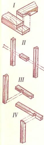 Например, такие соединения, как глухое гнездо или несквозные врубки на часть толщины материала, требуют немалого времени и достаточно высокой квалификации мастера. Не менее надежны, но гораздо более просты в исполнении, например, сквозные шипы при соединении стоек с обвязками и ригелями (узлы III и IV на рис. 2).