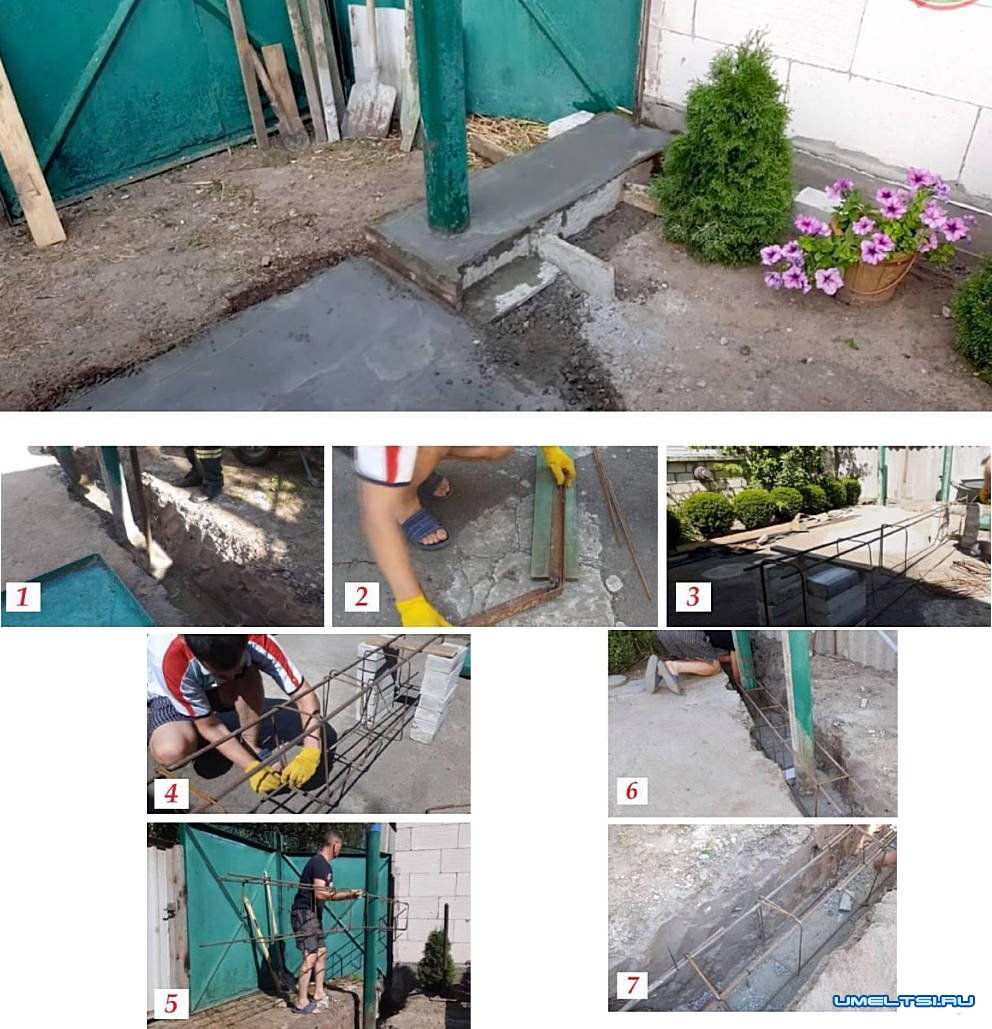 Затем соединил их у же в траншее отрезками арматуры с оставшимися хомутами (фото 7). После монтажа залил каркас цементно-песчаным раствором в пропорции 1:3. Осталось установить новые ворота и забор, а столбы обложить кирпичом.