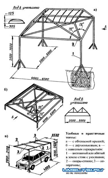 Если требуется тент небольшого размера (например, только для того, чтобы укрыть машину), то приемлема конструкция (в), состоящая из двух труб-стояков, изогнутых и скрепленных между собой стяжками с накладными деревянными поперечинами для последующей обтяжки или обшивки. У такого тента-навеса можно закрыть пленкой частично и боковую сторону.