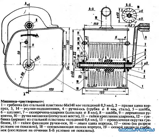 Схема устройства приспособления, по сути, довольно проста. Представьте себе небольшой жестяной барабан с двумя ручками: одна сверху — для переносим, другая сбоку — вращаемая, как у шарманки. Крутя ее, приводим во вращение внутри барабана обойму пружинистых гребенок, которые захватывают своими пластинчатыми зубцами находящийся на дне барабана раствор. По пути вращения зубцы натыкаются на попе-речный стержень-Ударник, пружинят от него и «выстреливают» налипшим на них раствором в расположенное напротив окно в стенке барабана.